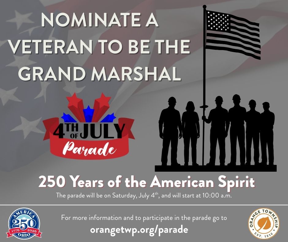 Orange Township is now accepting applications for the Grand Marshal of our Independence Day Parade, and this year is especially meaningful as we celebrate America’s 250th anniversary! This historic milestone makes our 4th of July celebration even more special, and we’re looking for someone who represents the pride, service, and spirit of our community.